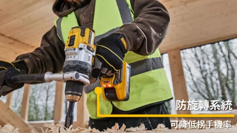 - ANTI-ROTATION 反旋轉系統:配備電子離合器,能在鑽頭卡住時偵測到過度旋轉並自動切換電源,保護使用者的手腕。
