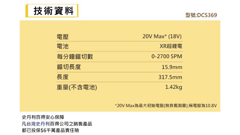 DeWAL得偉 | DCS369N | 20V MAX 無刷單手軍刀鋸