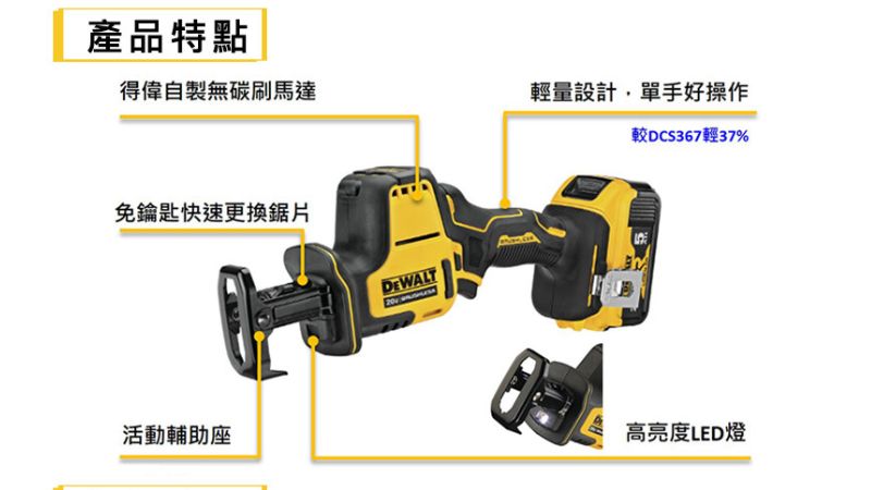 DEWALT DCS369 是一款隸屬於 ATOMIC™ Compact Series 系列的 20V MAX 無刷單手軍刀鋸*(Reciprocating Saw)。