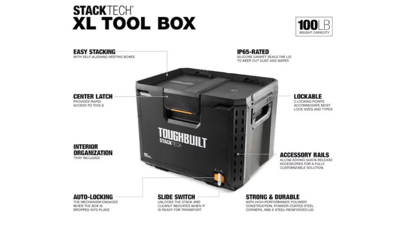 - 鋼製附件導軌: 箱體側面配備鋼製導軌,可免工具快速掛載 StackTech 系列的快扣配件。